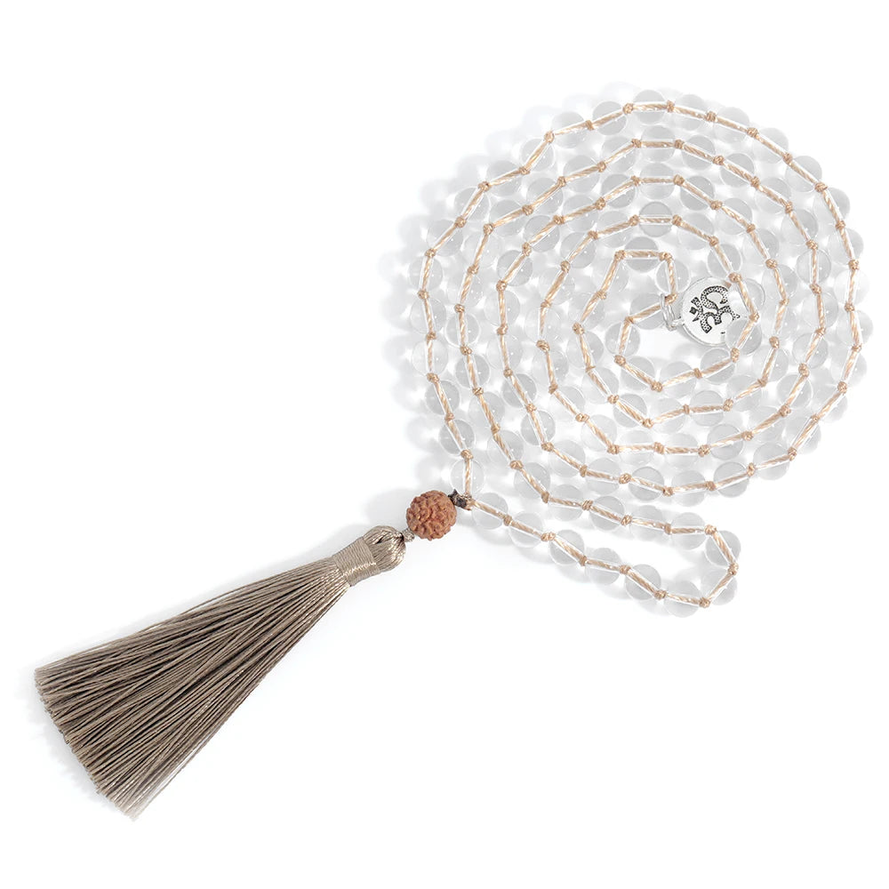 8mm White Crystal Beaded 108 Mala Handmade Knotted Long Necklace Women Fashion Charm Jewelry Rudraksha Khaki Tassel OM Pendant